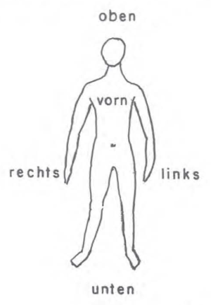 Unter der Überschrift „Vorder- und Rückseiten an den Extremitäten“[125], die formal derjenigen der Aufgaben von Vorder- und Rückseite entspricht, wird dann erläutert, dass die Definition der Vorder- und Rückseiten bei den zentralen Massen dem gängigen Verständnis entspricht, bei den Extremitäten aber eher von Innen- und Außenseiten gesprochen werde. Um diese der Muskelfunktion entsprechend zu nutzen, sei die Unterscheidung von Vorder- und Rückseite in gleicher Weise nötig.