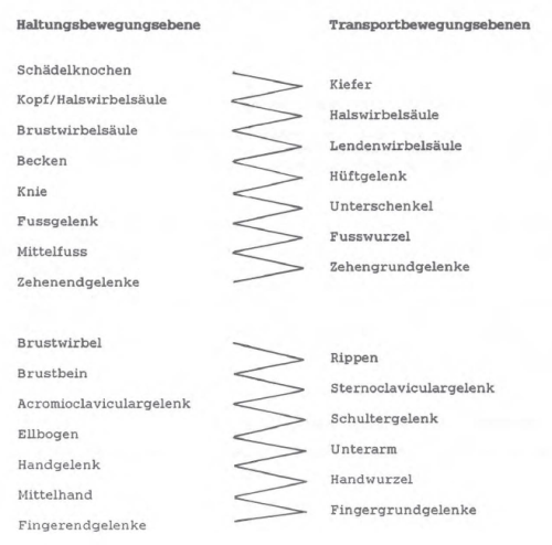 Anschließend wird auf eine spezifische Reihenfolge dieser beiden Bewegungsarten verwiesen. Sie wechseln sich über die Bewegungsebenen mit Haltungs- oder Transportbewegung ab. Diese ständig abwechselnde Reihenfolge sorgt einerseits für Stabilität und andererseits für Anpassungsfähigkeit. Unter der dritten Überschrift „Haltungsbewegungsebene – Transportbewegungsebenen“ folgt eine graphische Darstellung des Wechsels zwischen Haltungsbewegungsebenen und Transportbewegungsebenen durch eine Zickzacklinie. Dabei werden die einzelnen Bewegungsebenen genannt und zugeordnet (vgl. Abbildung).