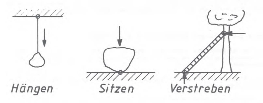 Die Definition von Hängen, Sitzen und Verstreben erfolgt durch eine stark vereinfachte physikalische textliche und bildliche Darstellung. Im Zentrum stehen dabei die Kontaktpunkte der in Beziehung stehenden Teile und die unterschiedlichen Kraftrichtungen.
